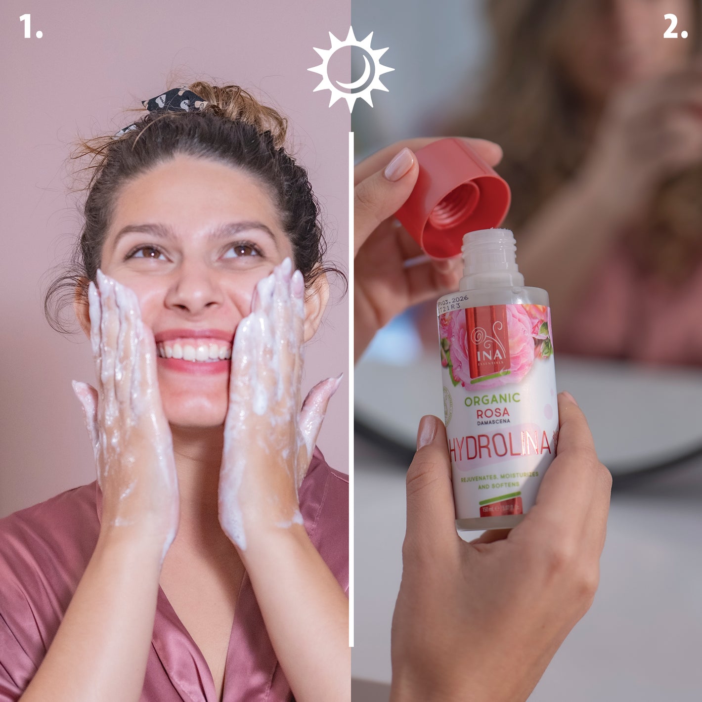 - Trin 2: Påfør derefter vores 100% Økologiske Rosenvand - Hydrolina. Rosenvandets antioxidante og antiinflammatoriske egenskaber forynger huden, reducerer fine linjer, fugter i dybden og skaber et beskyttende skjold mod forurenende stoffer i dagtimerne, hvilket giver din hud det perfekte miljø til at forny sig og hele.