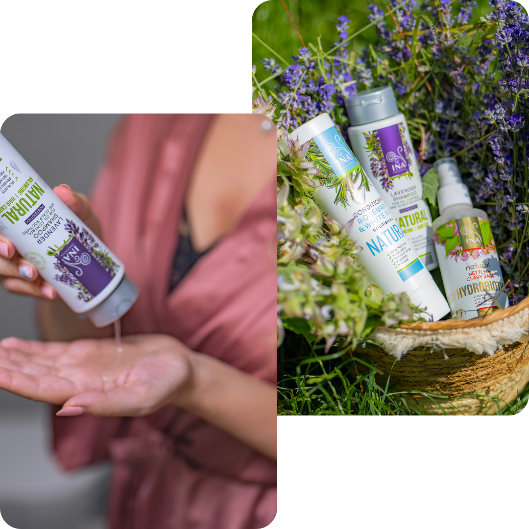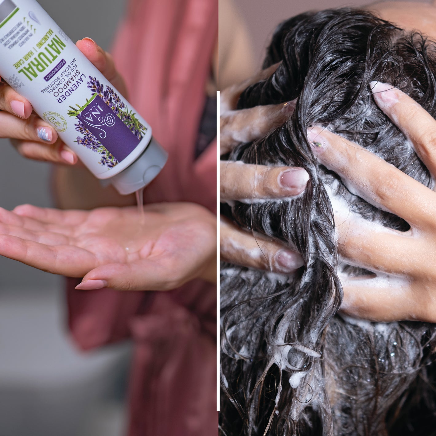 Trin 1: Vask forsigtigt dit hår og din hovedbund med vores nye og forbedrede Naturlige Lavendel Shampoo til skæl og sensitiv hovedbund.