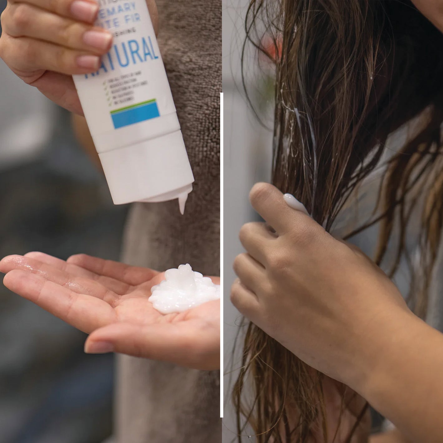 Trin 2: Påfør en tilstrækkelig mængde af vores Naturlige Hårbalsam med Rosmarinolie og Hvidgran i spidserne men undgå rødderne. Vent 2-5 minutter, og skyl.