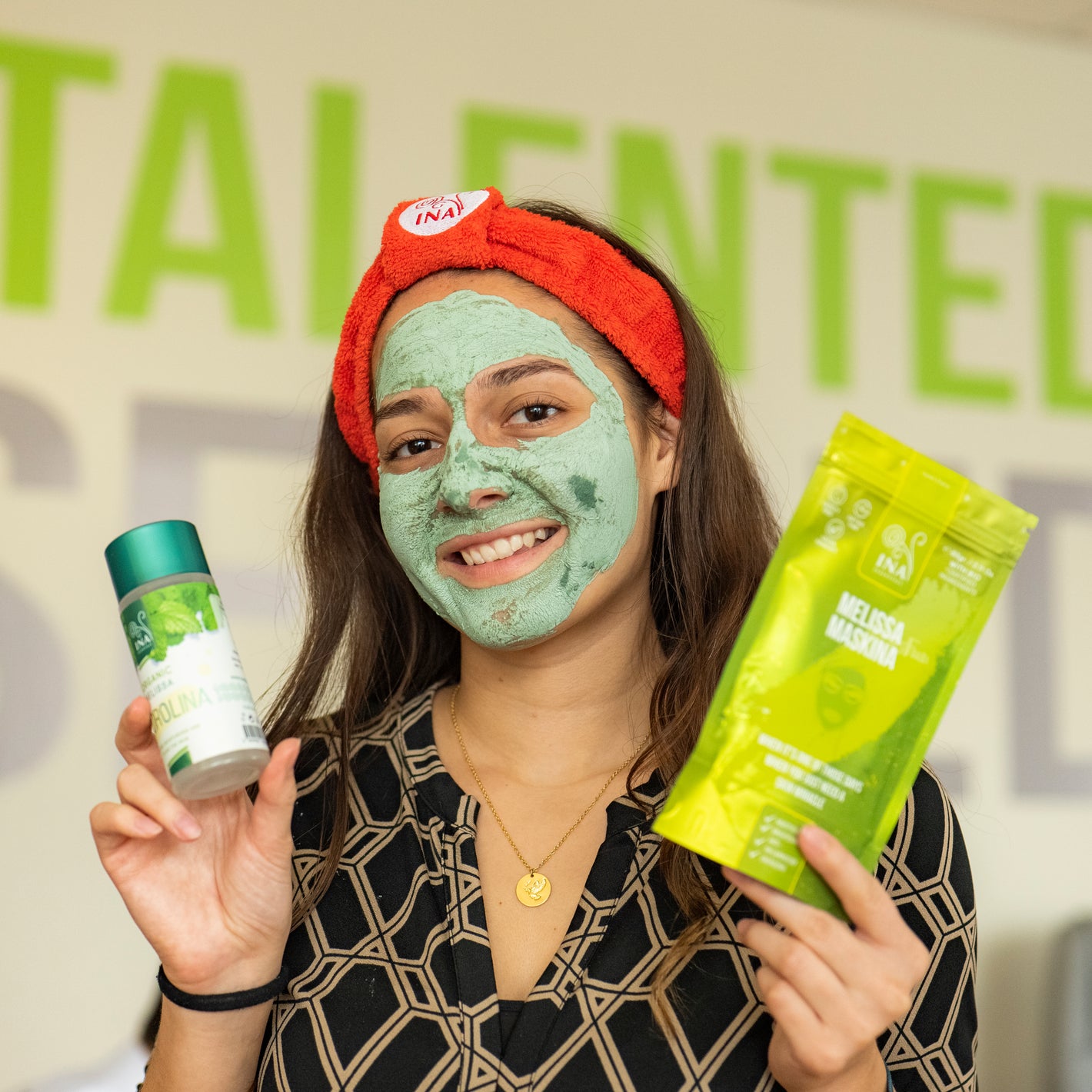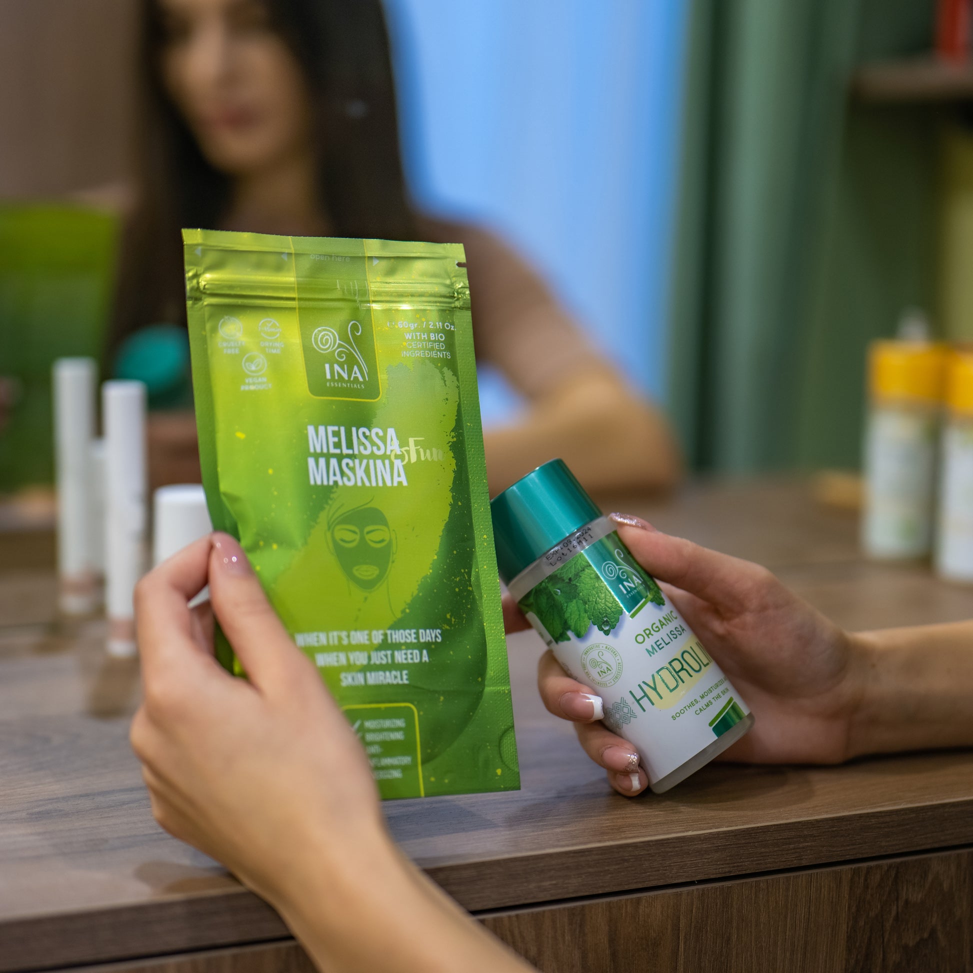 Og til sidst påfør InaEssentials' melissavand hydrolina for at tone huden op, hvis det er nødvendigt.