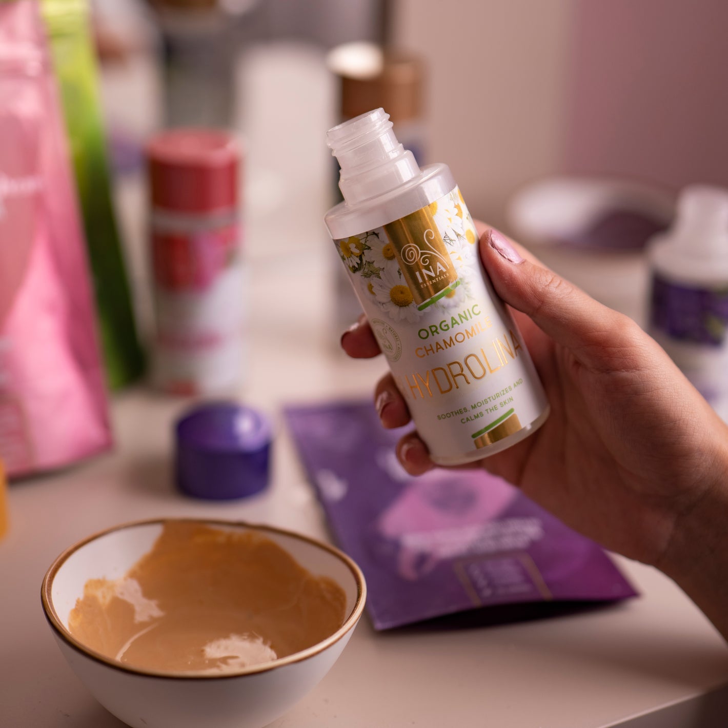 Og til sidst påfør InaEssentials' Kamillevand for at tone huden op, hvis det er nødvendigt.