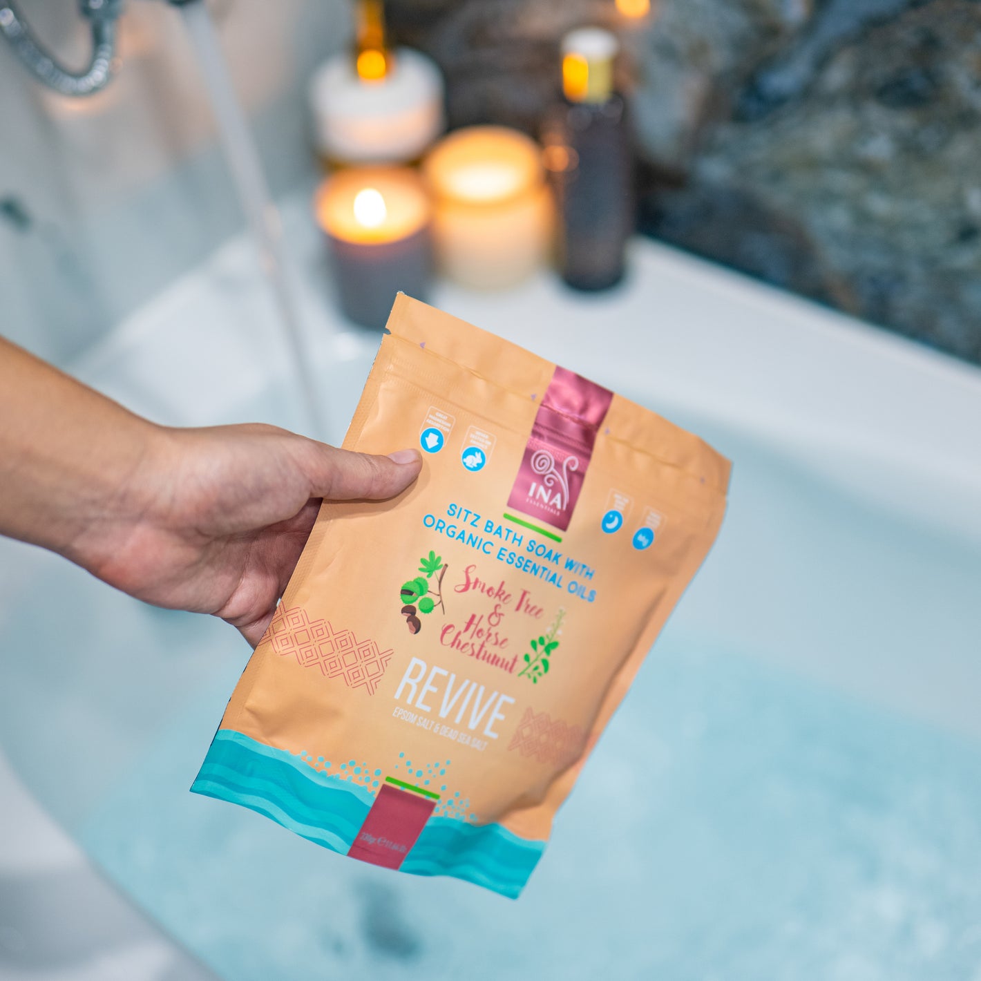 Vores InaEssentials Restore badesalte er en skånsom aflastningsformel med en gavnlig effekt på åreknuder og pleje efter fødslen. Baseret på 100% naturlige badesalte, hestekastanje- og sumak olier for nem restitution.
