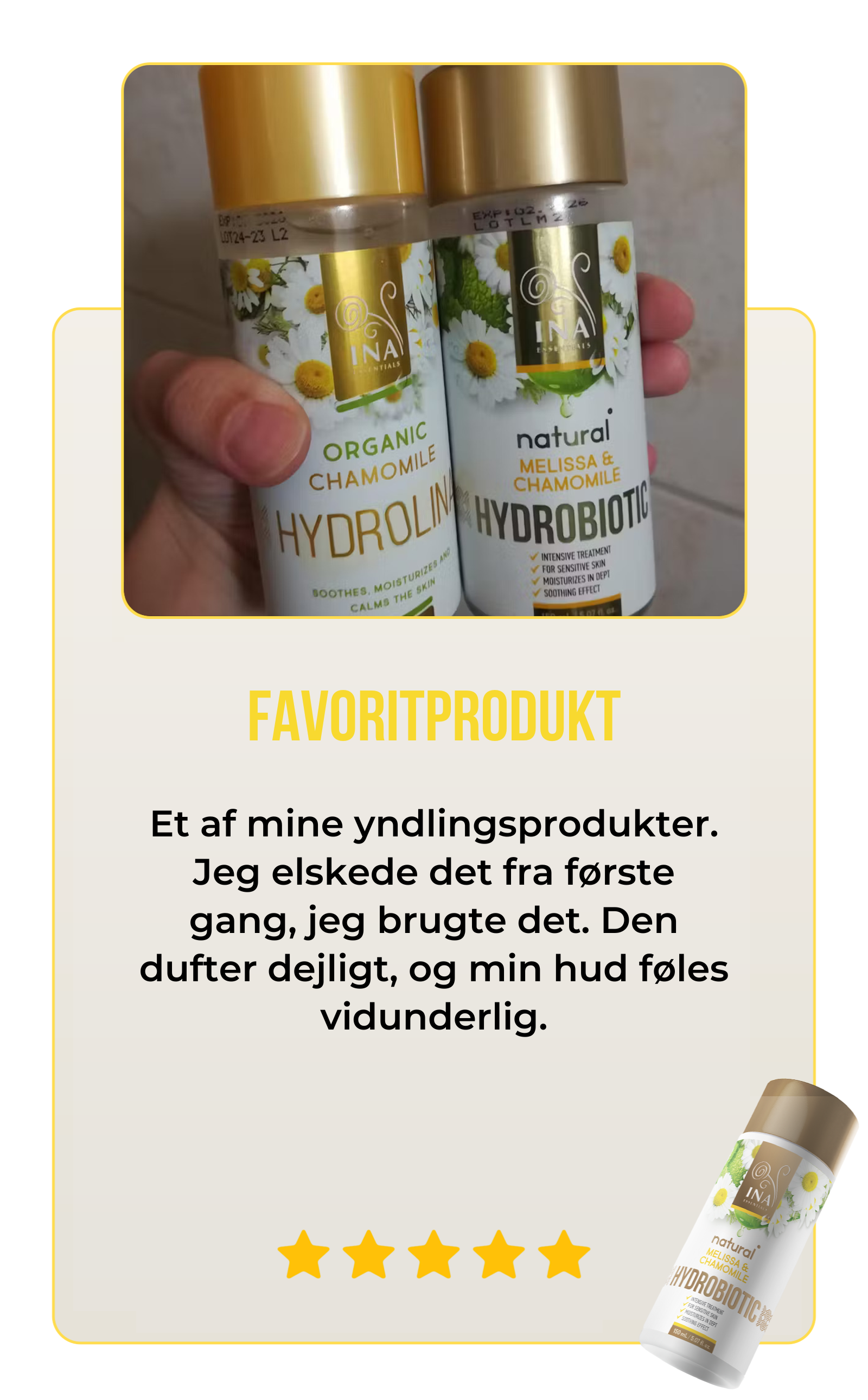 Hydrobiotic - Kamille, Citronmelisse og Aloe Vera er mere end en flot flaske. Den er forstærket af ægte kundeudtalelser. Med en imponerende kundetilfredshed på over 90 % beviser vores produkt sin effektivitet. Du skal ikke bare tage vores ord for det. Læs vores kunders historier HER.