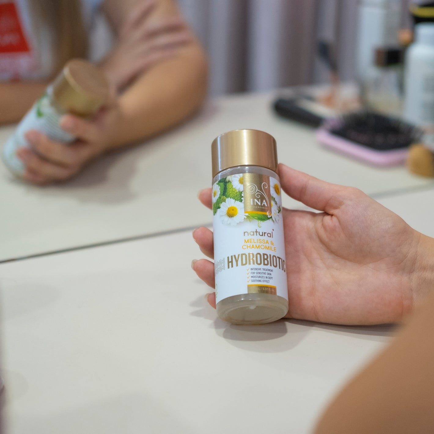 Vores økologiske Kamille og Citronmelisse Hydrolinas er fremstillet ved at destillere håndplukkede planter fra vores families økologiske marker. Kamille er kendt for sin evne til at berolige hudirritationer, mens citronmelisse fugter i dybden.