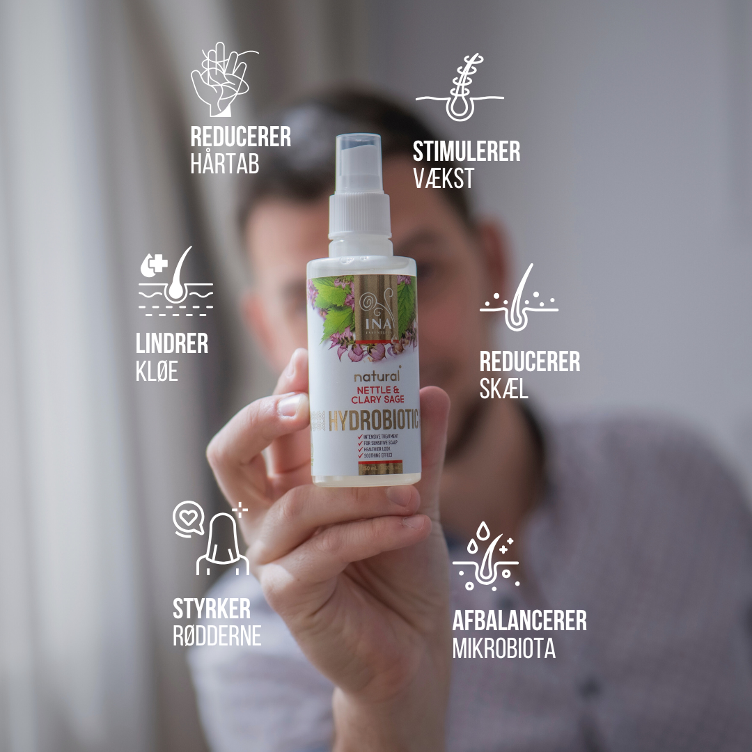 Hydrobiotic - Nælde & Salvie (150 ml) virker hele natten, når din krop og hovedbund naturligt regenererer. Det postbiotiske Hyperferment-kompleks beskytter og afbalancerer din hovedbunds mikrobiota. Produktet fremmer langvarig hårsundhed, bekæmper hårtab, brud og hovedbundsproblemer for alle hårtyper.