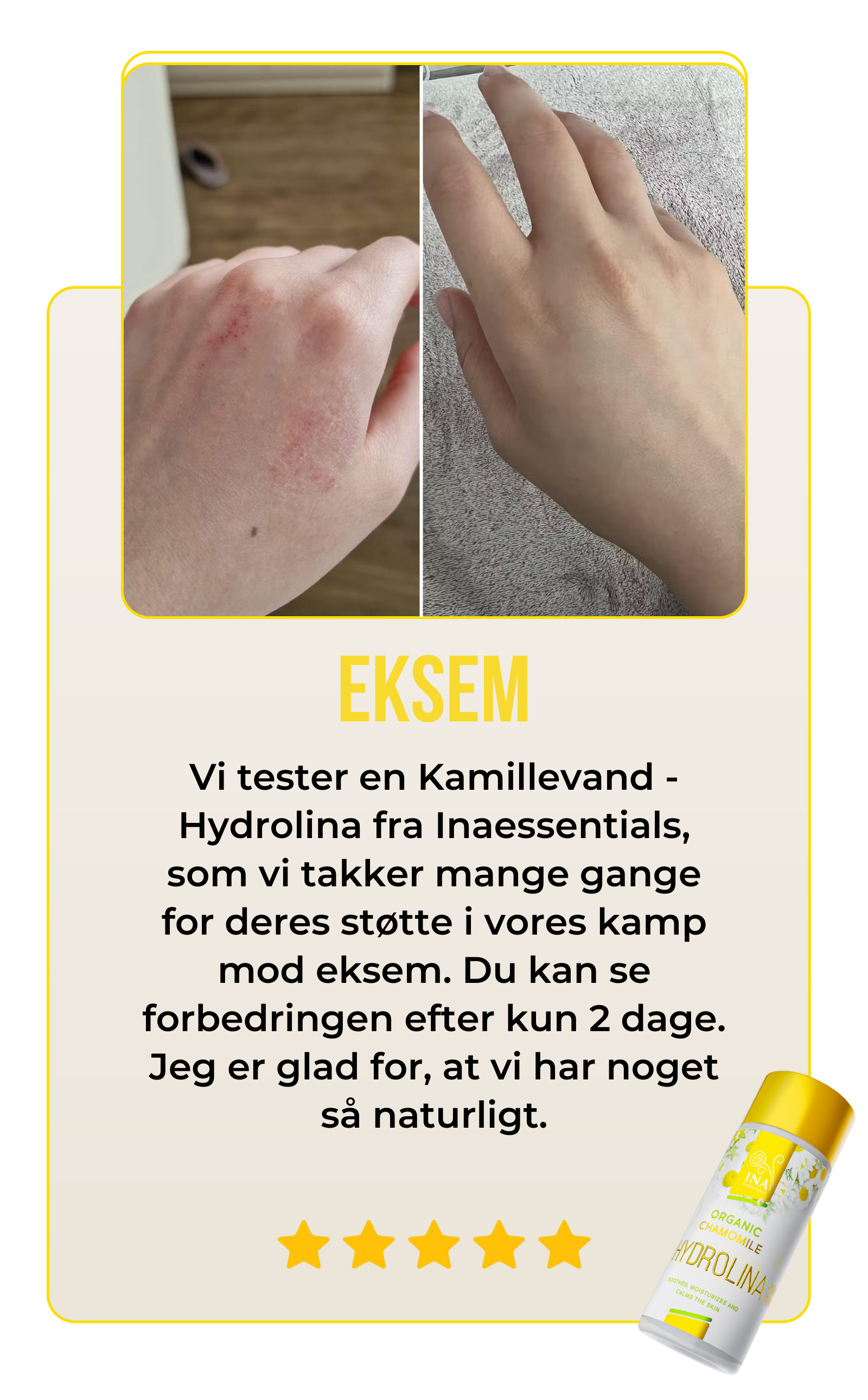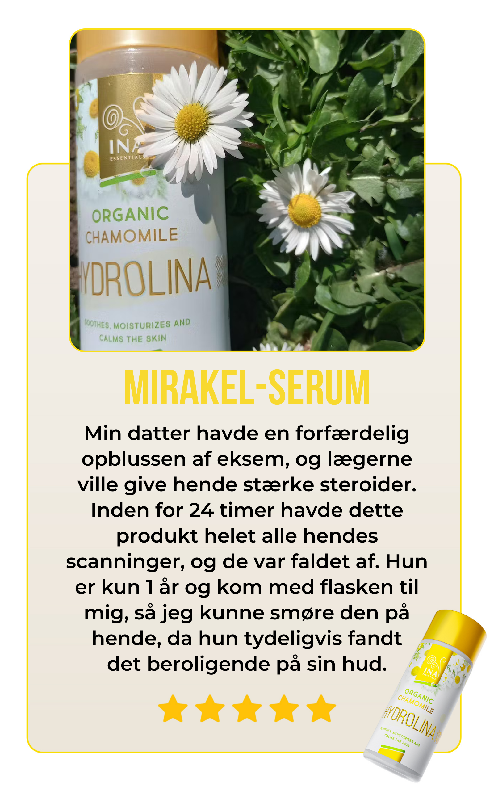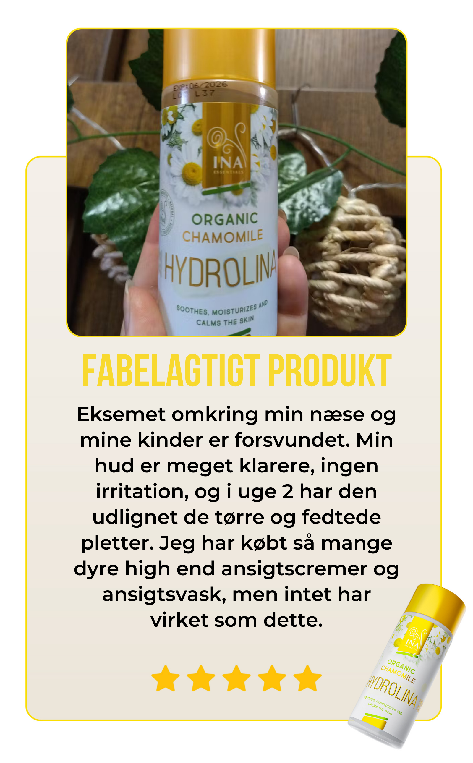 Økologisk Kamille Hydrolina er mere end bare en smuk flaske - den er styrket af ægte kundeudtalelser. Med en imponerende kundetilfredshedsscore på over 90% viser vores produkt sin effektivitet i at lindre eksem, udslæt og hudirritationer, samtidig med at det forbedrer din huds sundhed. Tag ikke blot vores ord for det, læs vores kunders historier.