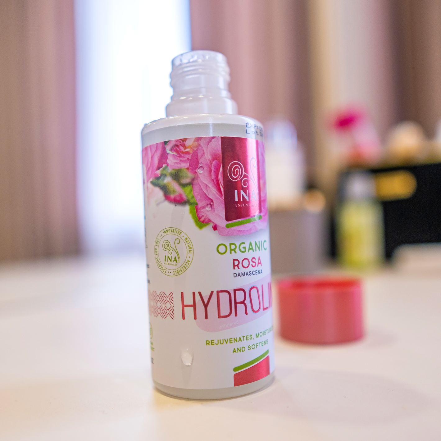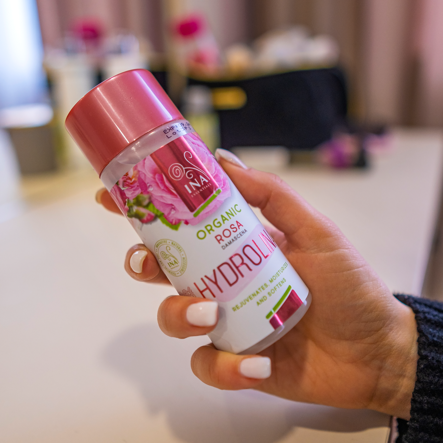 Økologisk Rose Hydrolina plejer huden, reducerer ujævnheder fra daglige urenheder og forbedrer dens naturlige udstråling.