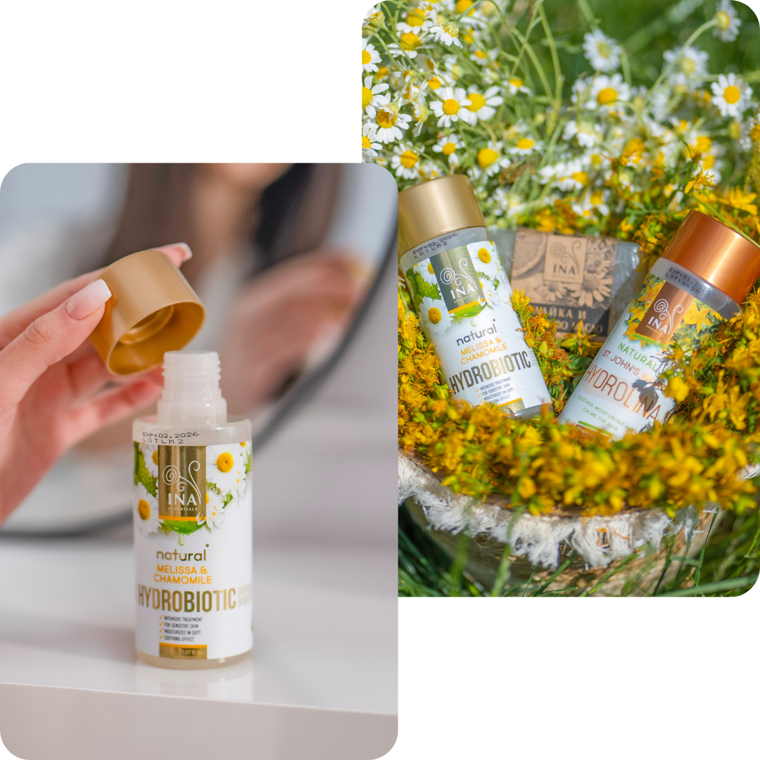 Samler kamille- og citronmelisse hydrolina med et stærkt postbiotisk kompleks af aloe vera. Chamomile Hydrolina fugter og bekæmper hudirritationer, mens Citronmelisse Hydrolina beroliger og reparerer. Det innovative Aloe-kompleks forstærker deres virkning og giver et stærkt forsvar mod skadelige mikroorganismer.