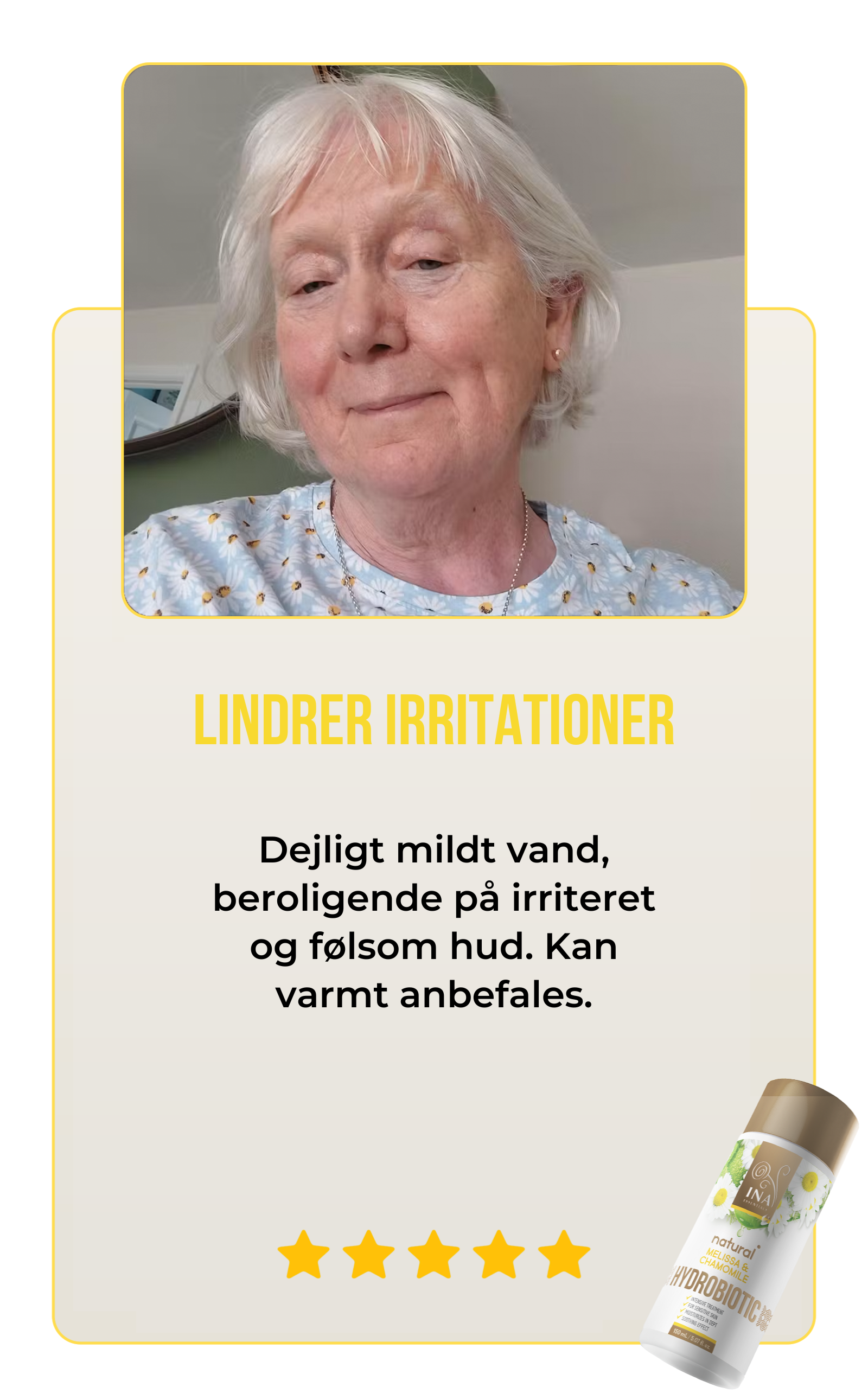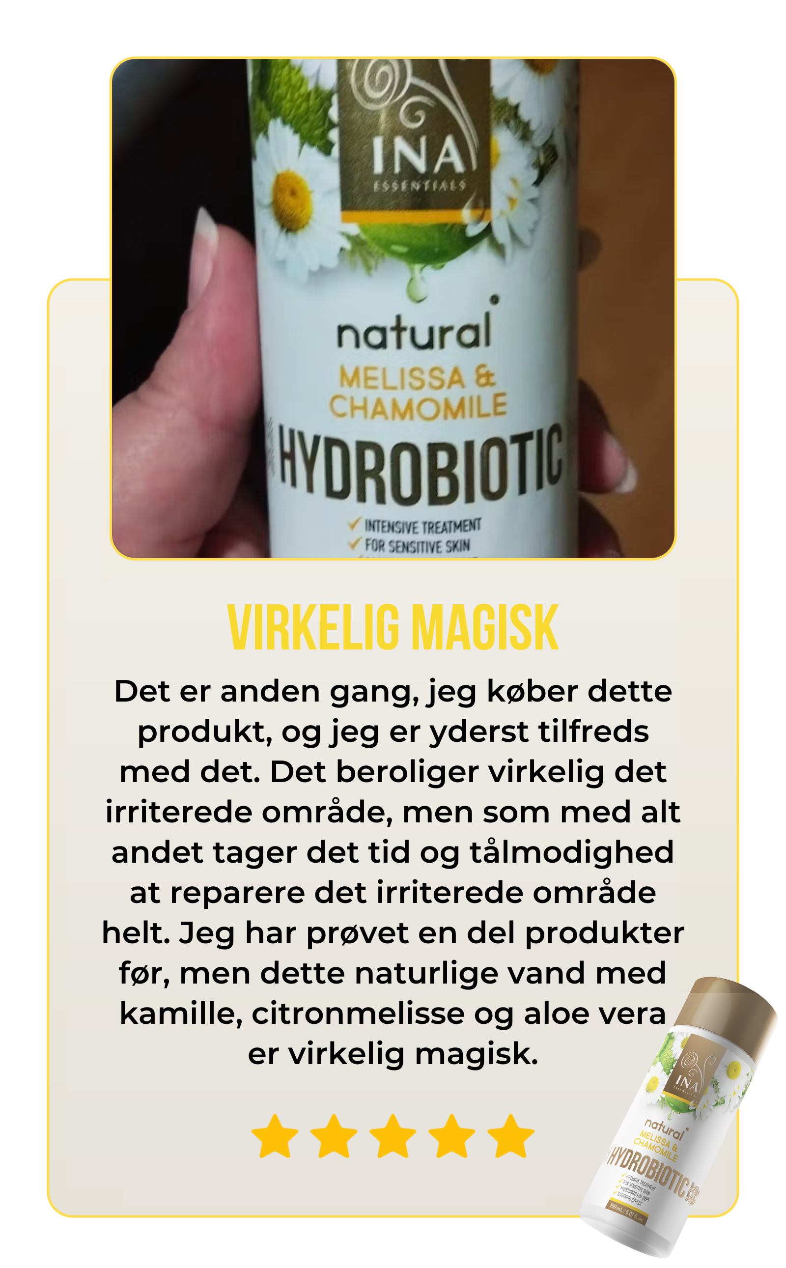 - Trin 2: Påfør derefter Hydrobiotic - Kamille, Citronmelisse og Aloe vera.