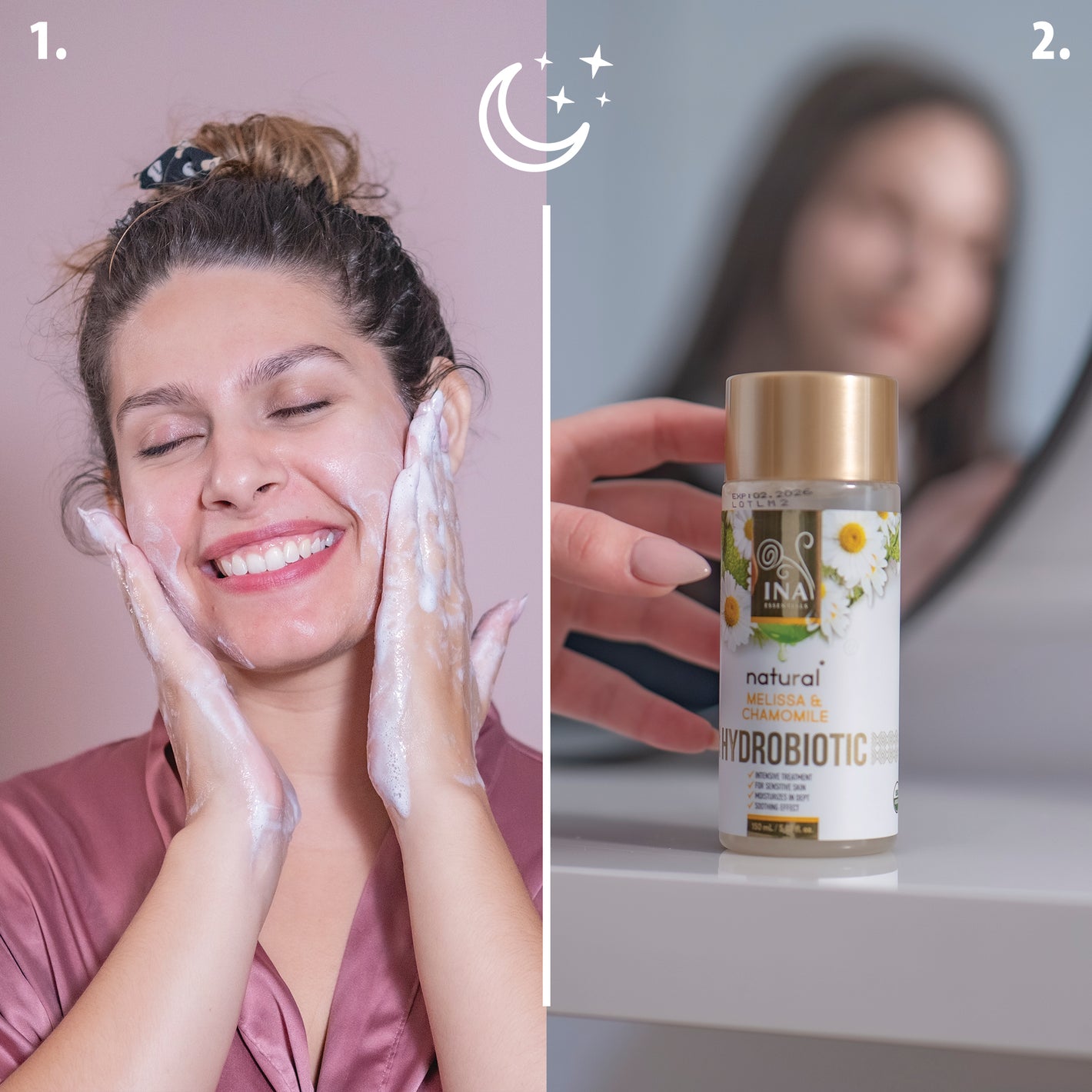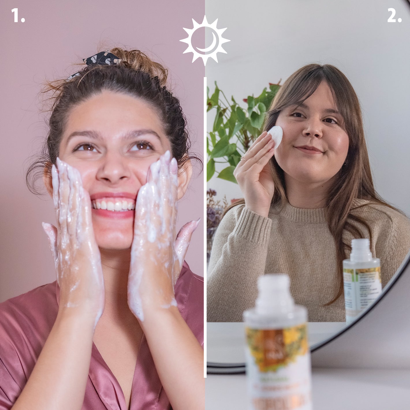 - Trin 1: Om aftenen gentages rensningen med vores Kamille Urtesæbe for at vaske dagens forurenende stoffer af.