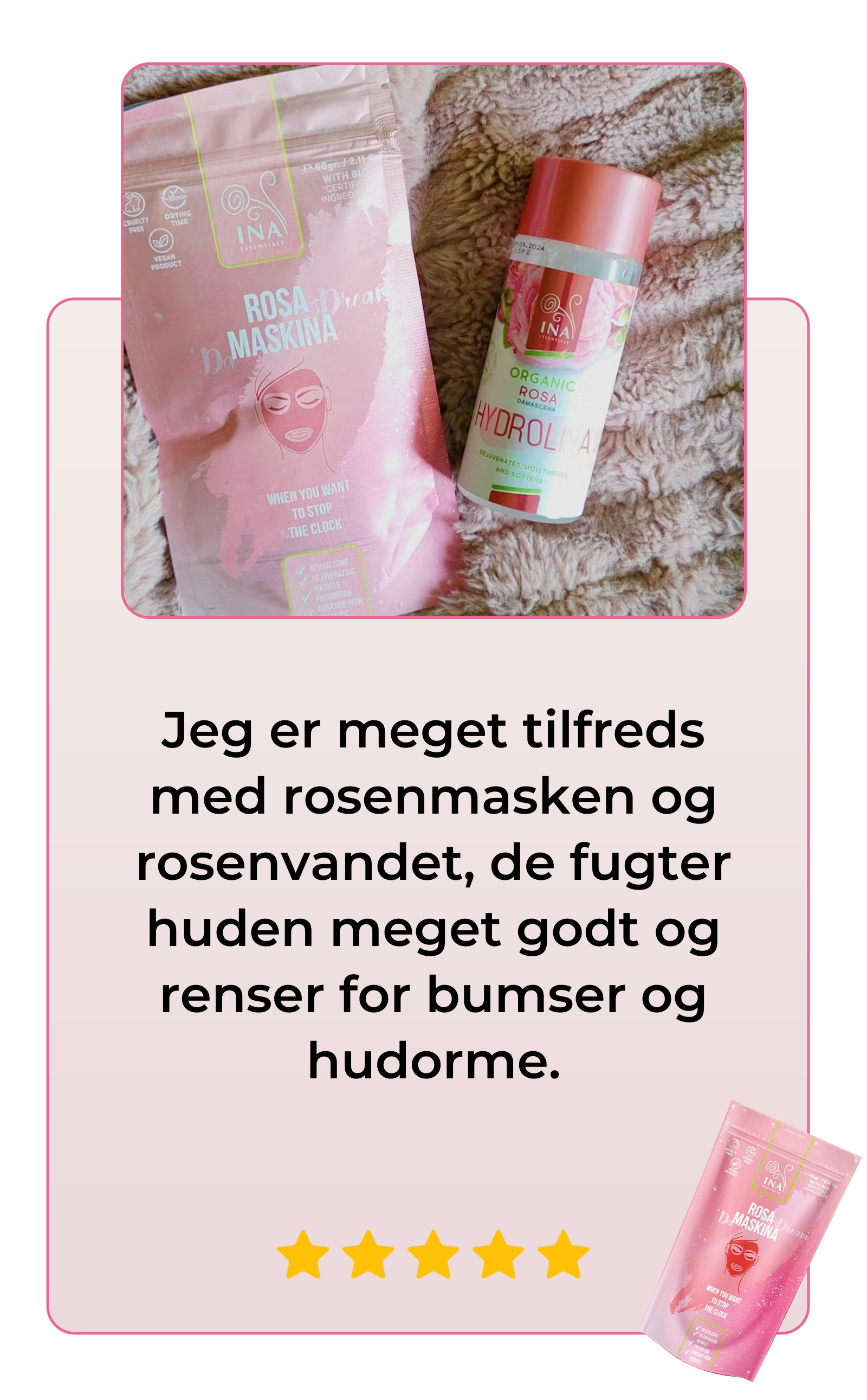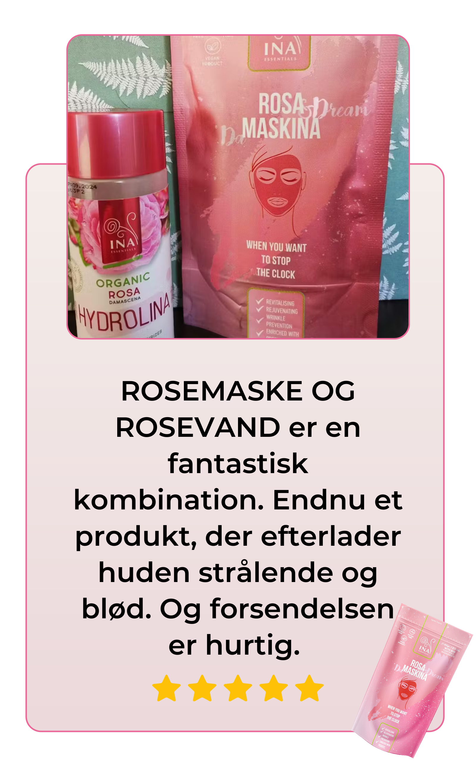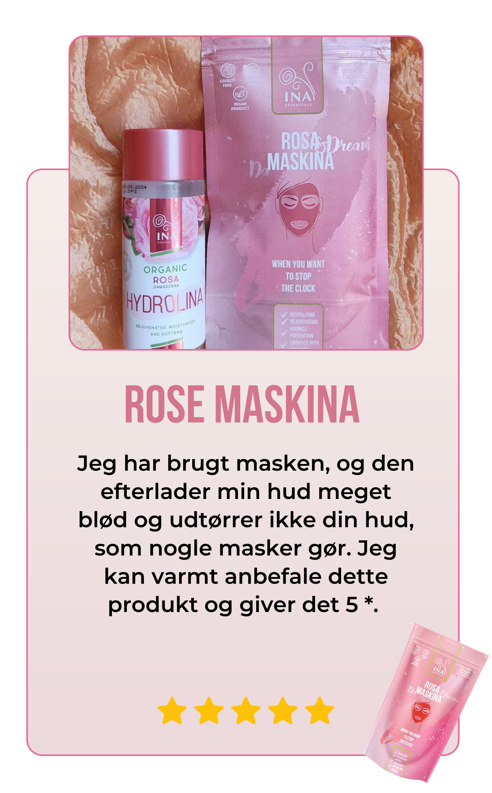 Ved regelmæssig brugholder den foryngende effekt af Rose Maskina længere. Huden er strammere og mere fugtet. På grund af kombinationen af Rose, Aroniabær og Prebiulin Fos har den en antioxidant effekt, og hudens regenerering stimuleres.