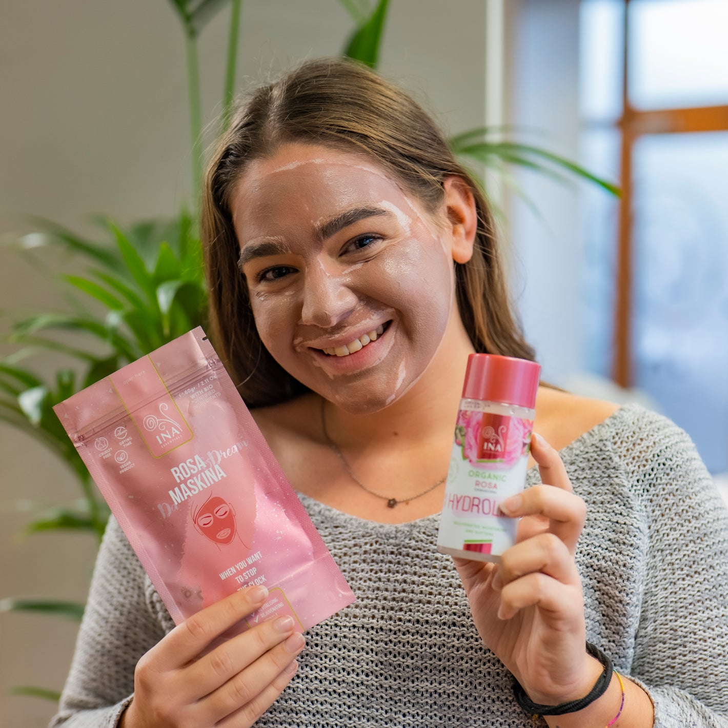 Og til sidst påfør InaEssentials' Rosenvand hydrolina for at tone huden op, hvis det er nødvendigt.
