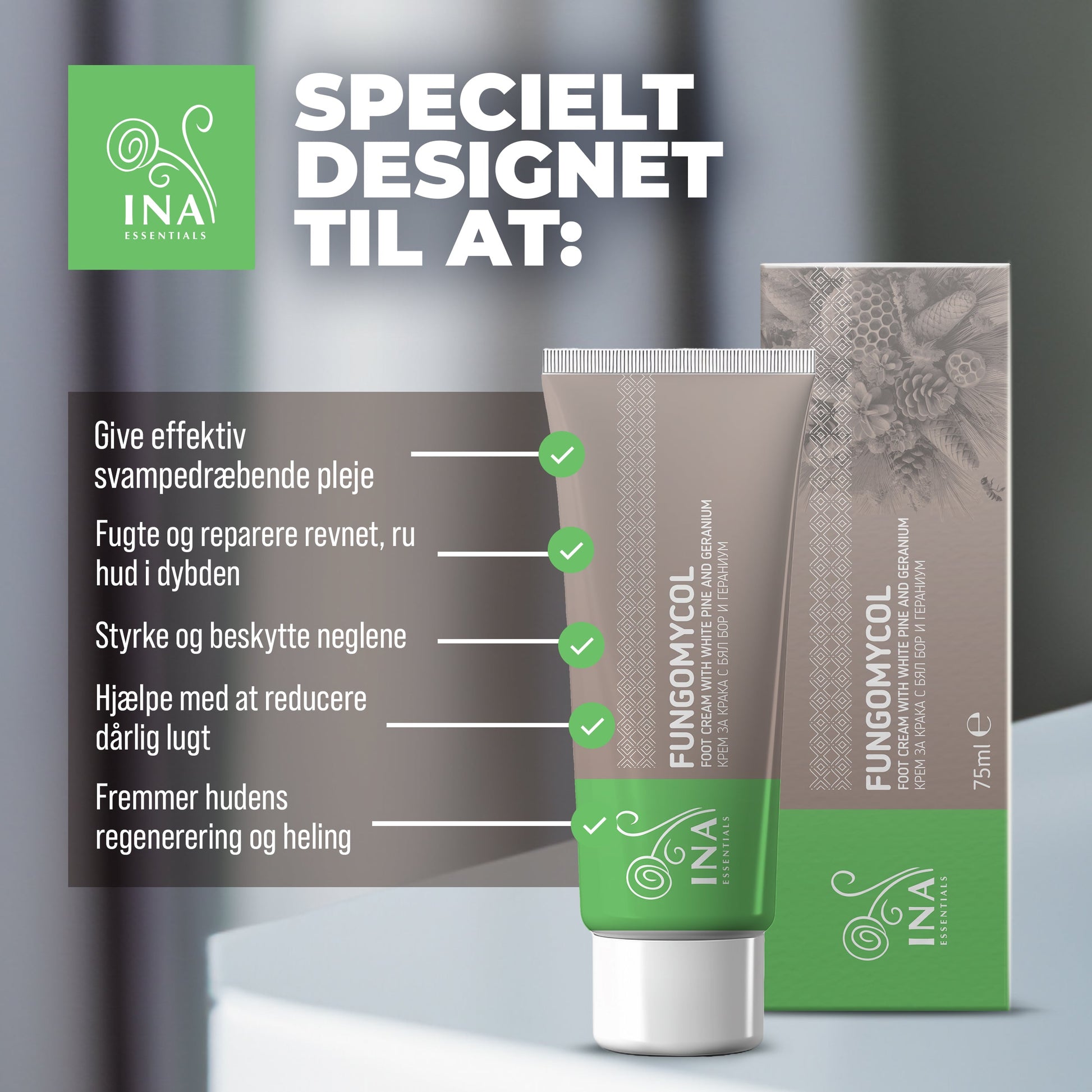 1. Fungomycol fra InaEssentials er en skånsom creme af høj kvalitet med naturlige aktive ingredienser og dobbeltvirkning. Den er specielt udviklet til at bekæmpe fod- og neglesvamp samt ru og revnet hud på albuer og hæle.