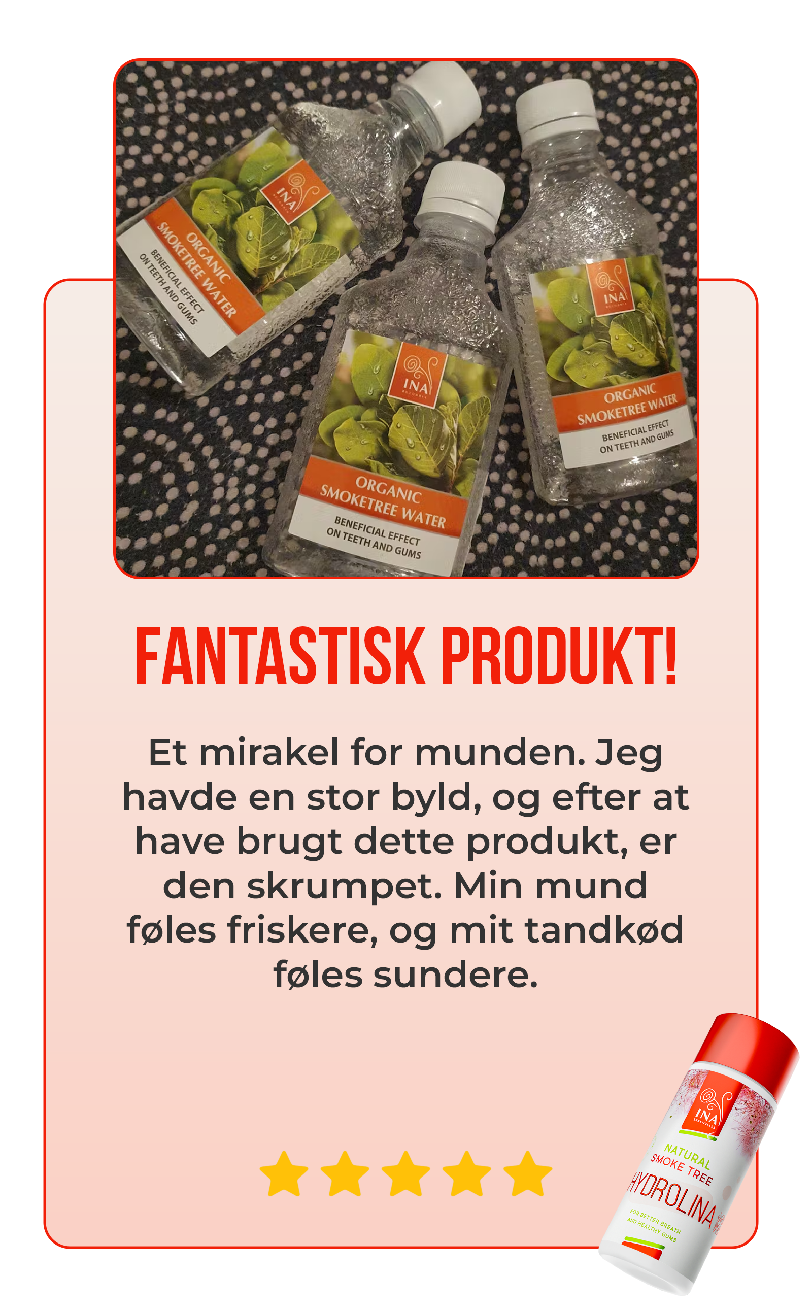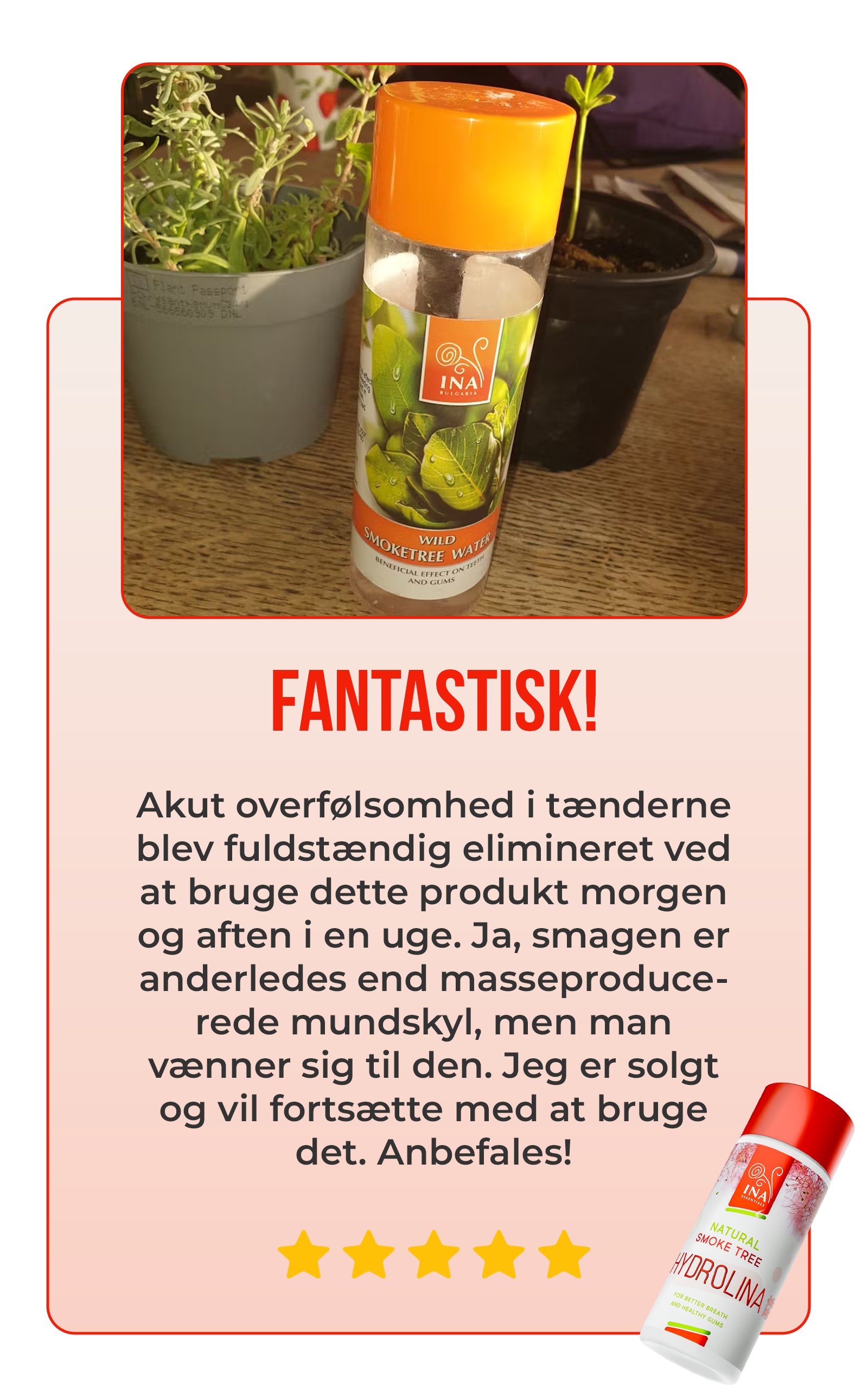 Forny din mundhygiejne med Parykbusk (Røgtræ) Hydrolina, vores mundskyl mod dårlig ånde, blødende tandkød og paradentose. Det ideelle valg for dem, der oplever tandkødsproblemer, dårlig ånde, mundsår og afte.